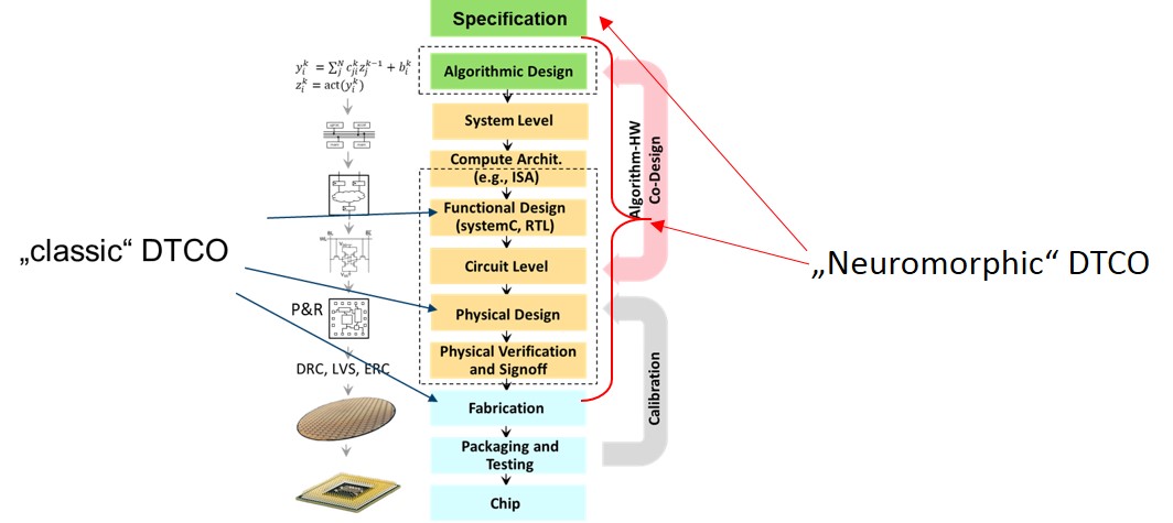 While classic DTCO seeks technological optimization, in order to improve the KPI of the Fixed Logic Design and focuses on the interplay between ISA ⇄ Software, neuromorphic DTCO solves problems of use cases and focuses on the quality of result metrics. It applies optimization on all levels of design hierarchy including the material substrates in the device level. For this quantitative models are needed to exchange the necessary information between design levels.